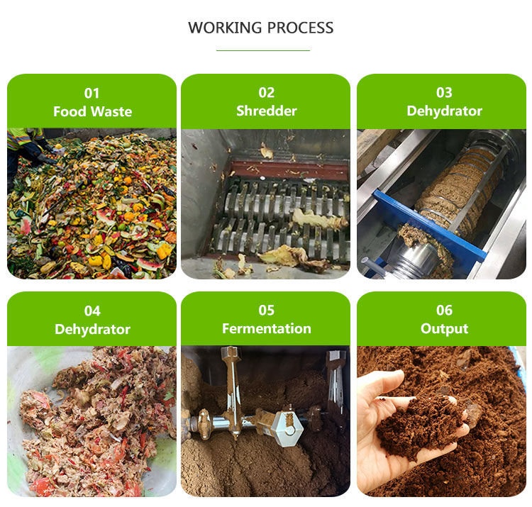 เครื่องกำจัดขยะอินทรีย์ ของเรา ประกอบด้วยระบบการทำปุ๋ยหมักและถังหมัก เครื่องยกถัง แท่นคัดแยกอัตโนมัติ เครื่องแยกน้ำ สายพานลำเลียง เครื่องบดย่อย เราสามารถปรับแต่งให้ตัวยกถังขยะสำหรับถังขยะขนาดต่างๆ เครื่องบดย่อยสามารถรองรับวัสดุเปียกและแห้งได้ โดยใช้เครื่องบดแบบหมุนสวนทางคู่ขนานสองตัวที่ตัด เฉือน ฉีก กด และฉีกด้วยความเร็วต่ำภายใต้แรงบิดที่สูงมาก แยกขยะอินทรีย์และอาหารออกเป็นชิ้นเล็กๆ โดยทั่วไปจะเป็นแถบหรือรูปร่างคล้ายชิป เครื่องแยกน้ำถูกติดตั้งไว้ใต้เครื่องบดย่อยเพื่อบีบของเหลวออกจากวัสดุอินทรีย์ โดยทำงานในโหมดต่อเนื่อง (ไม่ใช่แบบเป็นชุด) ชิ้นส่วนที่สัมผัสของเหลวทำด้วยสแตนเลส SUS304 เพื่อให้แน่ใจว่าอายุการใช้งานยาวนาน วัสดุอินทรีย์ และเศษอาหารที่มีน้ำ 30-80% หลังจากบีบแล้ว ปริมาณความชื้นของผลิตภัณฑ์ขั้นสุดท้ายจะอยู่ที่ประมาณ 30-40% ขยะอินทรีย์ที่หั่นฝอยและแยกน้ำออกจะถูกส่งไปยังถังหมัก ถังหมักเป็นหนึ่งในอุปกรณ์สำคัญในอุตสาหกรรมการทำปุ๋ยหมักขยะอินทรีย์และเศษอาหาร มีความจุขนาดใหญ่ ใช้พลังงานต่ำ และค่าบำรุงรักษาต่ำ
